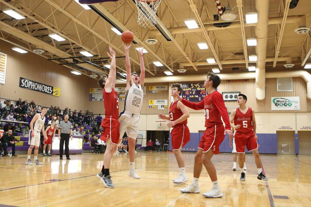 Brennon Ney, surrounded by Snohomish defenders, fires up a jumper for Oak Harbor. From left for Snohomish are Kolton Smith, Cameron Bonorden, Kalvyn McDaniel and Wyatt Wilson. (Photo by John Fisken)