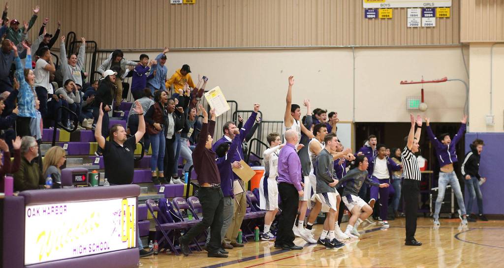 The Oak Harbor fans and bench react to Dorian Hardin’s game-winning shot.(Photo by John Fisken)