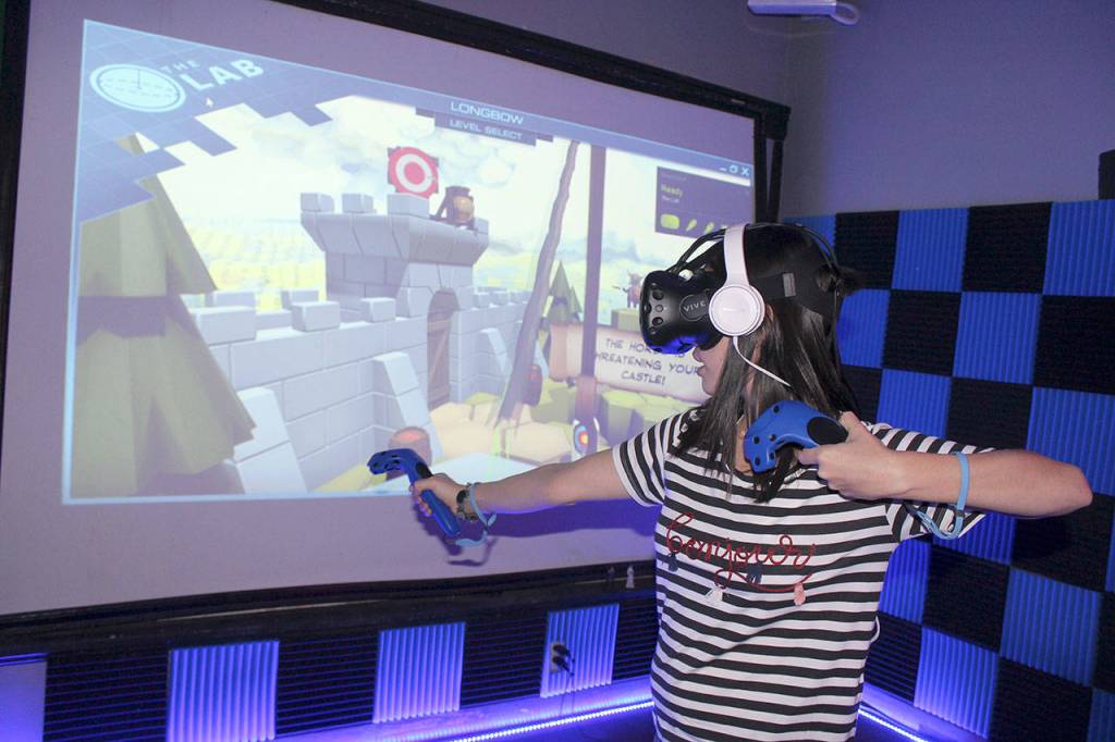 Silvana Iosve recently donned Holodeck Virtual Reality gear and shot arrows at marauding Vikings at the Machine Shop in Langley. Photos by Patricia Guthrie/Whidbey News Group