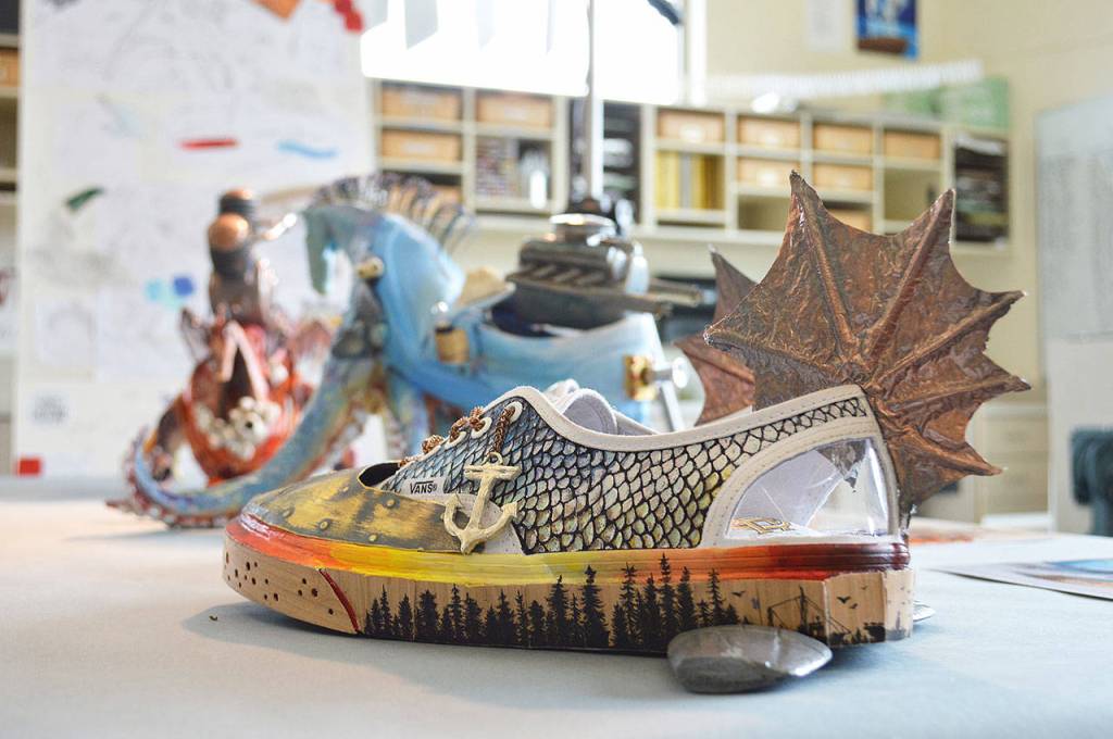 Students drew inspiration from the Navy, natural landscape and wildlife of the island for the “Local Flavor” pair. The detailed shoes are covered in hand-painted fish scales with trees and sunset details on the bottoms. The students used the packing that the shoes came in for wings and cut the Vans logo tag into two salmon, one of which features a small yet intricate drawing of Deception Pass Bridge. Inside the shoes are tide pools, with sculpted crabs and found seashells. On the bottoms of the shoes are more shells and paintings of orcas. Hand-crafted chains that lead to an anchor serve as laces.