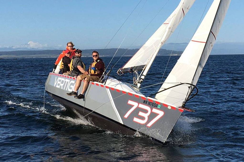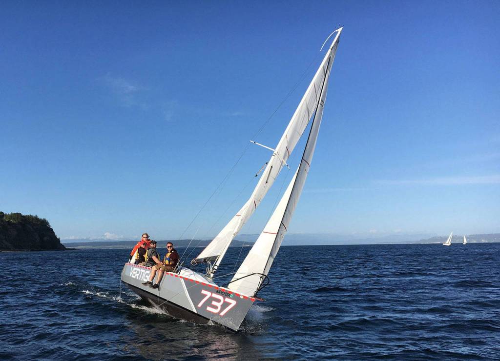 With a win in last week’s race Thursday, May 31, Shannon Buys aboard Vertigo moved into a tie for first place in the Oak Harbor Yacht Club spring sailing series.