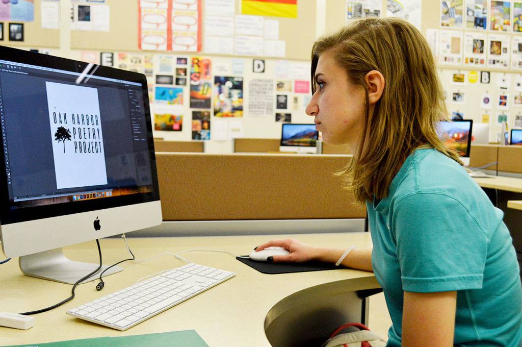 Brenna Rothman, Oak Harbor High School junior, opens her design for the Oak Harbor Poetry Project logo. Her’s was chosen out of around 25 submitted by the high school advanced graphic design students. Photo by Laura Guido/Whidbey News-Times