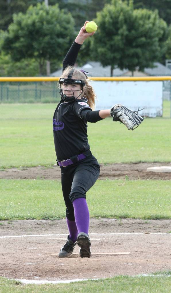 The Bat Busters’ Reese Wasinger hurls a pitch in her 15-strikeout win over the Blue Dragons Wednesday. (Photo by Jim Waller/Whidbey News-Times)