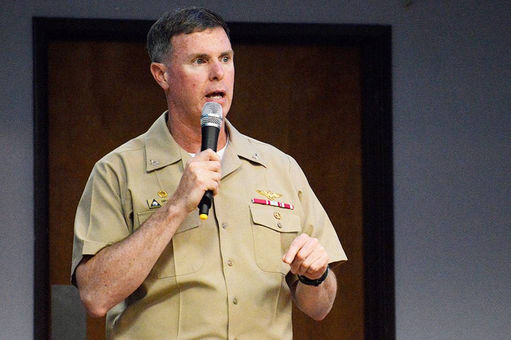 Capt. Geoffrey Moore, Naval Air Station Whidbey Island commanding officer, delivered his final “State of the Station” to the Oak Harbor Chamber of Commerce Thursday in Oak Harbor.