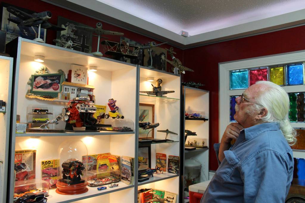 Now, they meet in Benninghoff’s brightly colored Man Cave that’s lined with shelves and glass cabinets displaying hundreds of models, dioramas and collections.