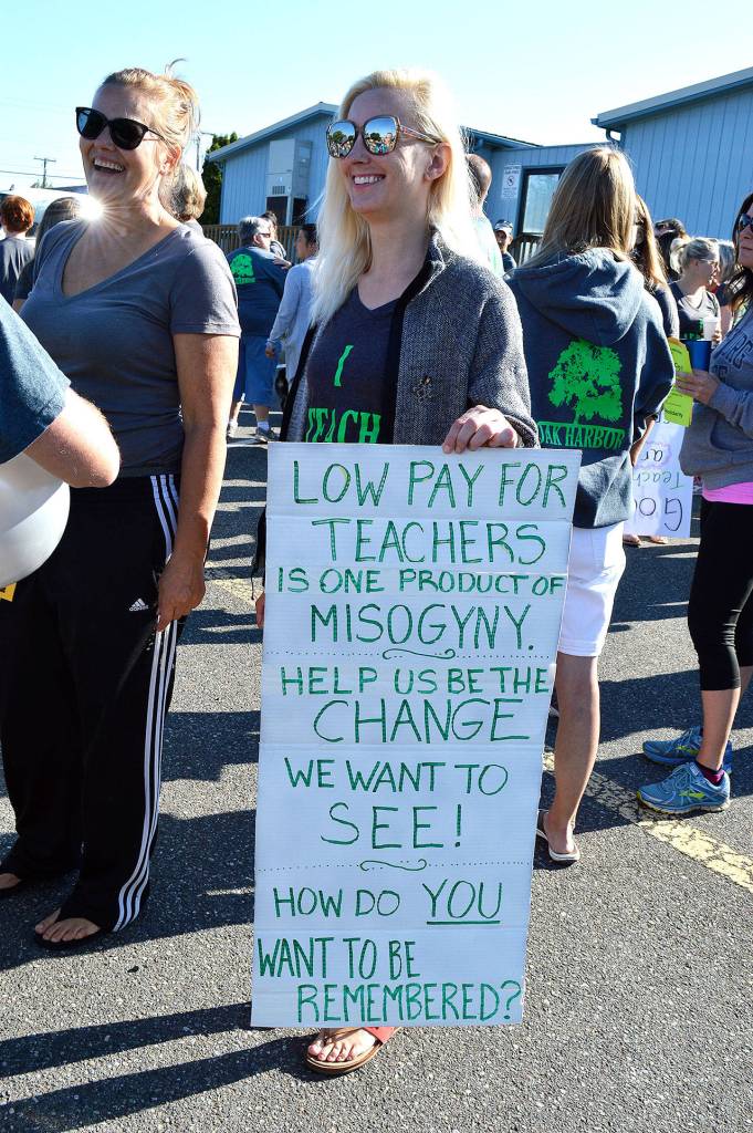 Lindsey Smith, a teacher at Oak Harbor Intermediate School, holds up a sign at a union rally Tuesday morning. Bargaining had reached a stalemate over a perceived cap in salary increases that has since been resolved, according to the district and union members. Photo by Laura Guido/Whidbey News-Times