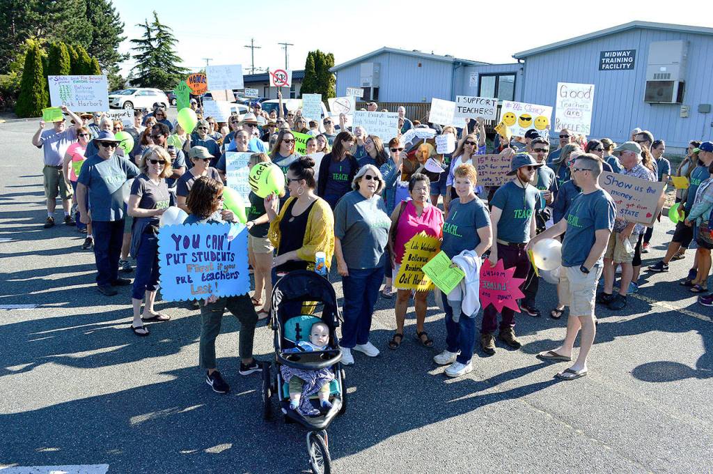 Around 120 Oak Harbor Education Association members gathered Tuesday morning in front of the Midway Training Facility, the sight of bargaining negotiations. Union members said Tuesday’s crowd had double the number of a similar rally last year. Photo by Laura Guido/Whidbey News-Times