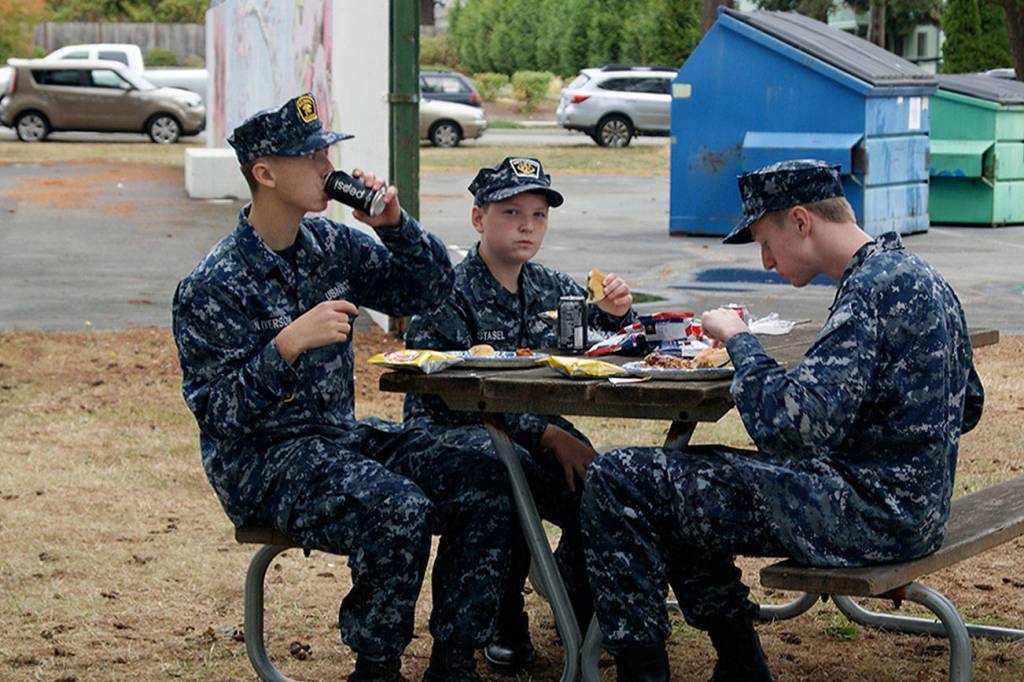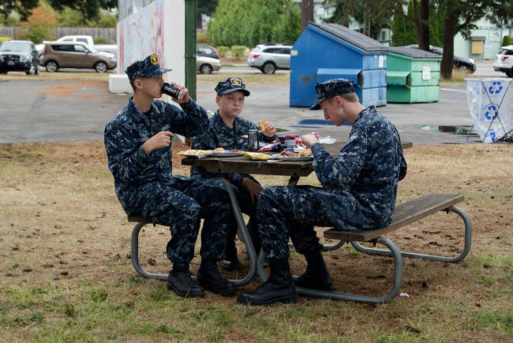 Naval Air Station Whidbey Island Sea Cadets Jackson Oliverson, David Stasel and Andrew Taylor enjoy food served at Saturday’s Military Appreciation Picnic.