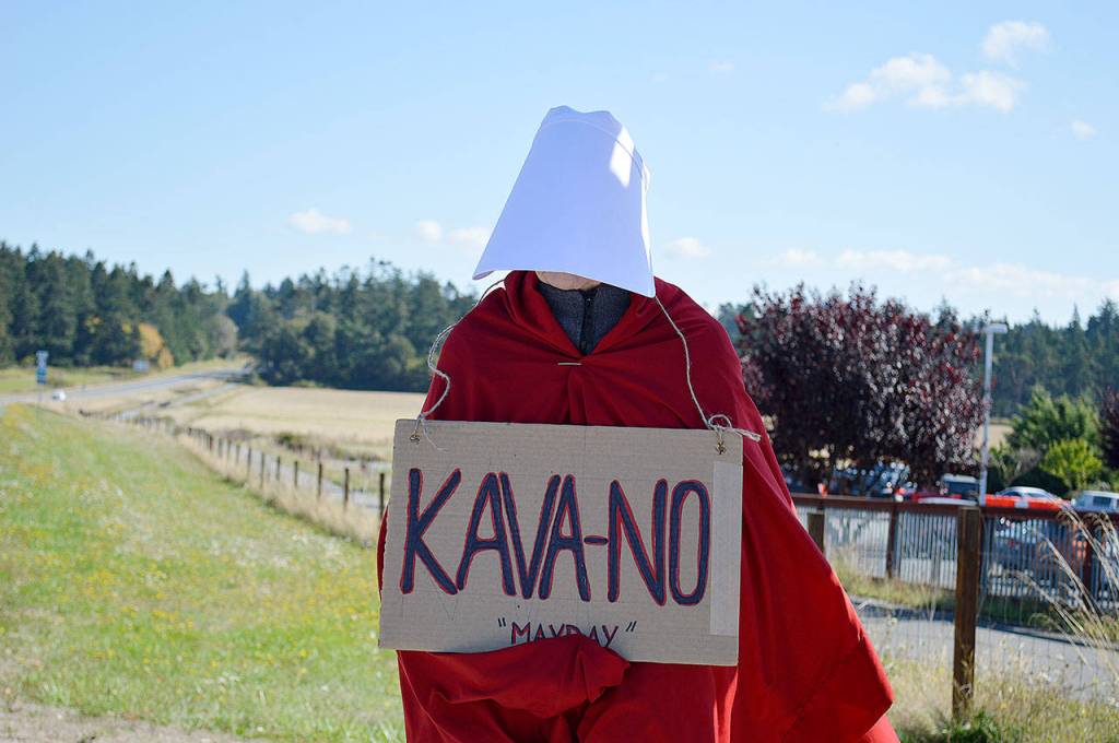 Marran Gray, wearing the cloak and headdress from the series “The Handmaid’s Tale,” stands in a protest against the nomination of Brett Kavanaugh to Supreme Court. The TV show depicts a patriarchal society that treats women as property of the state. Photo by Laura Guido/Whidbey News-Times