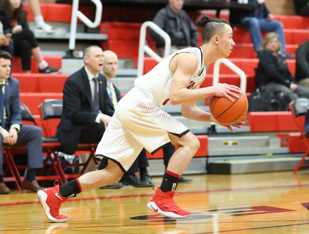Jered Brown hustles the ball up the court for the Wolves. (Photo by John Fisken)