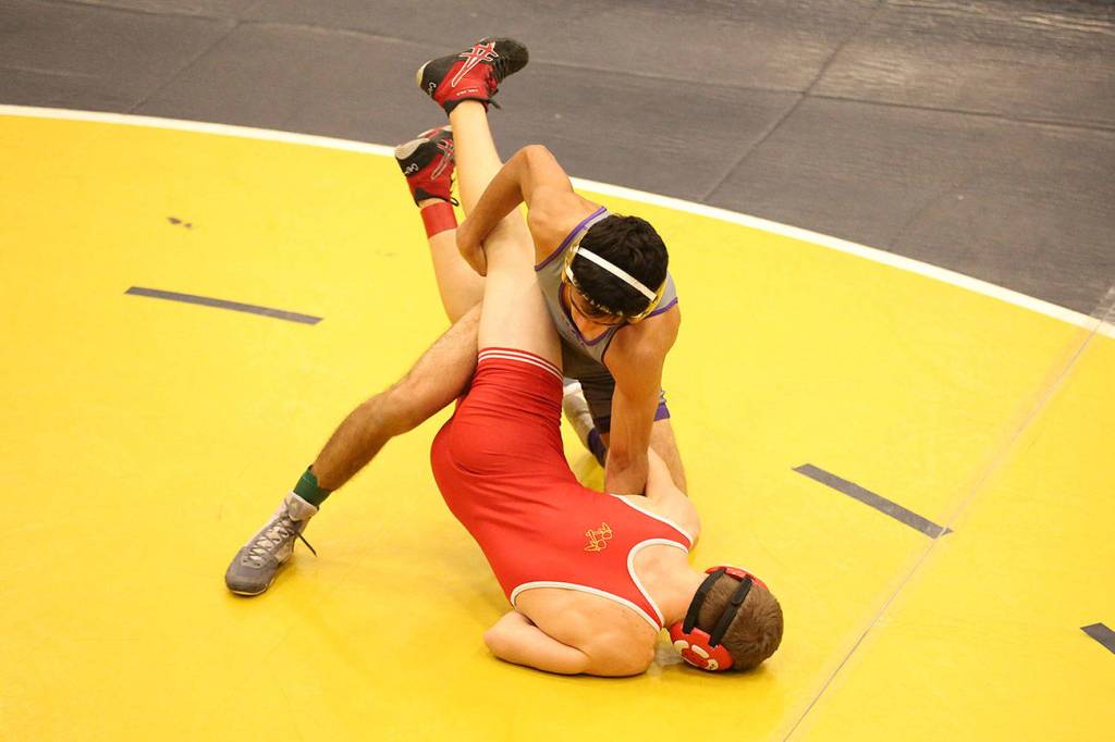 Oak Harbor’s Caleb Fitzgerald, top, defeats Snohomish’s Tyson Johnson in the first round of the subregional tournament. Fitzgerald won four straight matches to claim the 126-pound title. (Photo by John Fisken)
