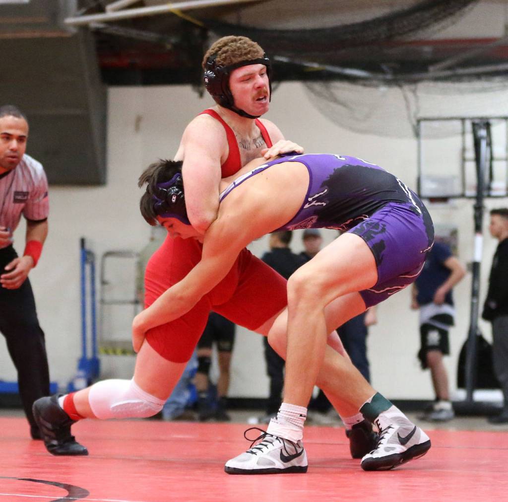 Oak Harbor’s Jakob Daily, right, defeats Todd Smith of Arlington. (Photo by John Fisken)
