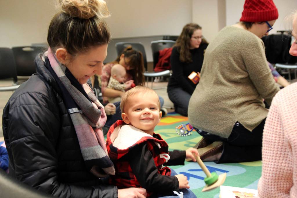 Rebekah Reisen, 6 months old, plays with other children at Baby Storytime. “I like that it’s not just reading, I like that she can interact with other little babies. She just loves it,” said Rebekah’s mother, Elizabeth Reisen, of Oak Harbor.