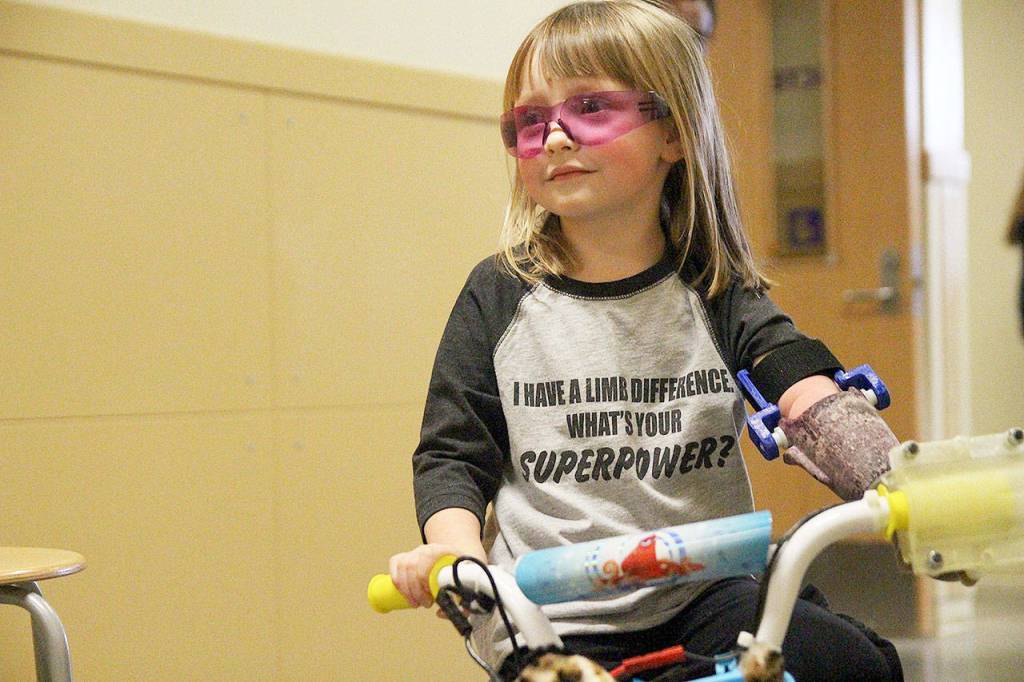Michaela wore purple-tinted safety glasses, which she called her “night-vision” goggles and her shirt read “I have a limb difference. What’s your superpower?” Amanda said her daughter sometimes asks questions about her arm, but she’s very good at adapting.