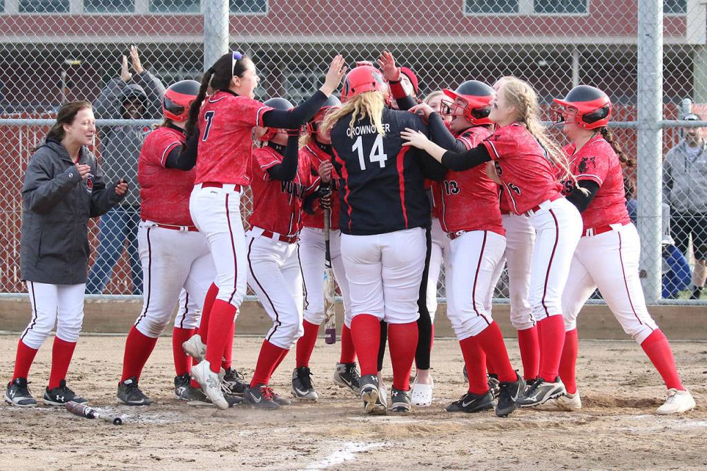 Coupeville’s Veronica Crownover (14) is mobbed by the Wolves after hitting a three-run home run against Oak Harbor.(Photo by John Fisken)