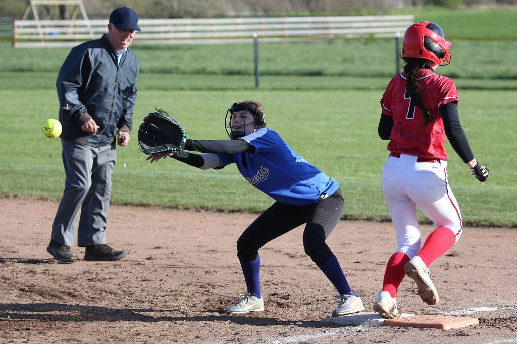 Coupeville’s Scout Smith (7) reaches first base before South Whidbey’s Melody Wilkie makes the catch as umpire Randy James looks on.(Photo by John Fisken)