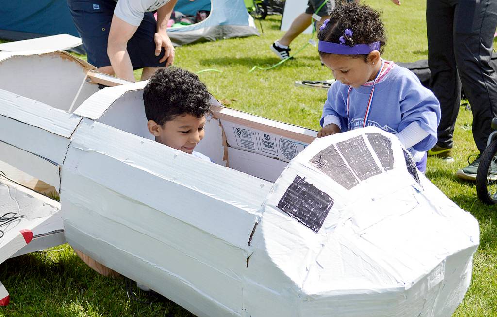 Dezmyn Ledbetter, 6, hangs out inside his home-made airplane Saturday toward the end of Relay for Life. This year’s theme was “race for a cure; put cancer in the dust.” His 3-year-old sister Gianna Ledbetter checks out the craft. Photo by Laura Guido/Whidbey News-Times