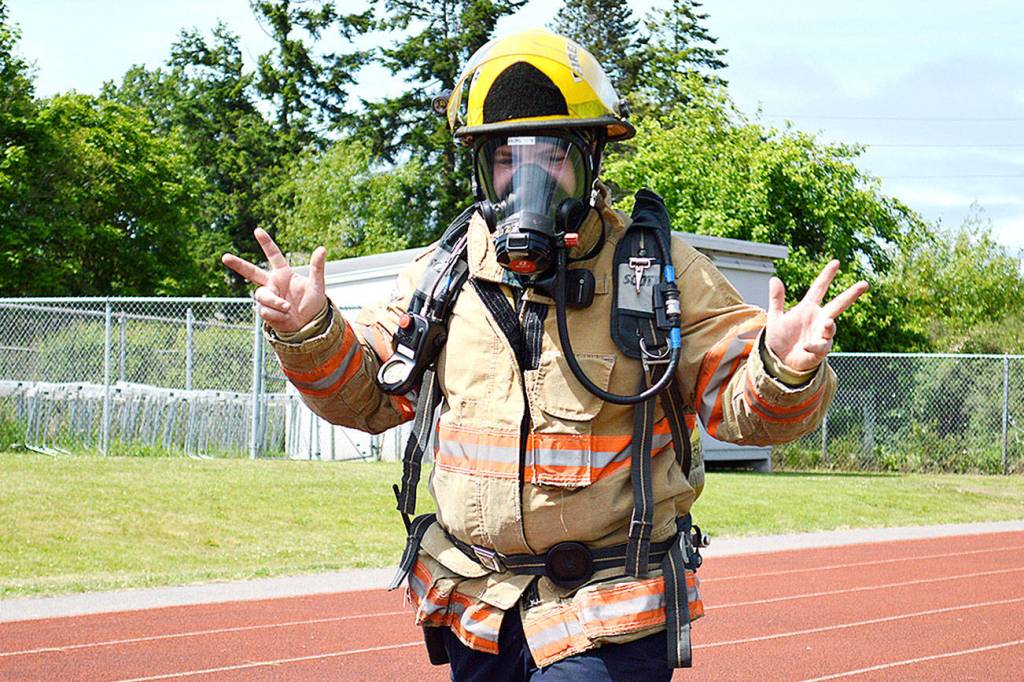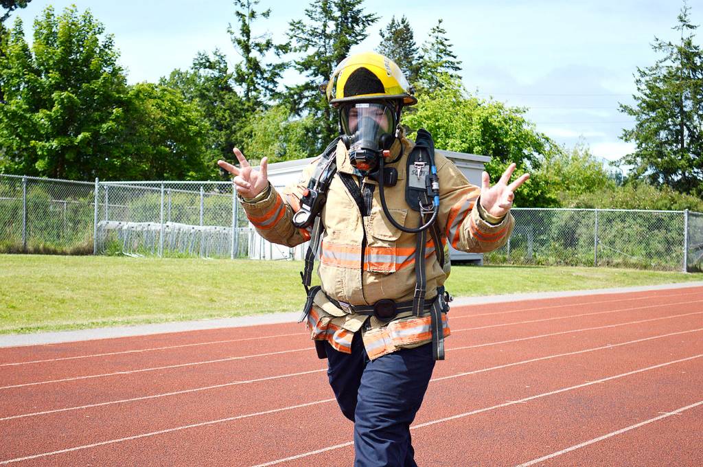 North Whidbey firefighter Jimmy Zimmerman walks the North Whidbey Middle School track Saturday. Photo by Laura Guido/Whidbey News-Times