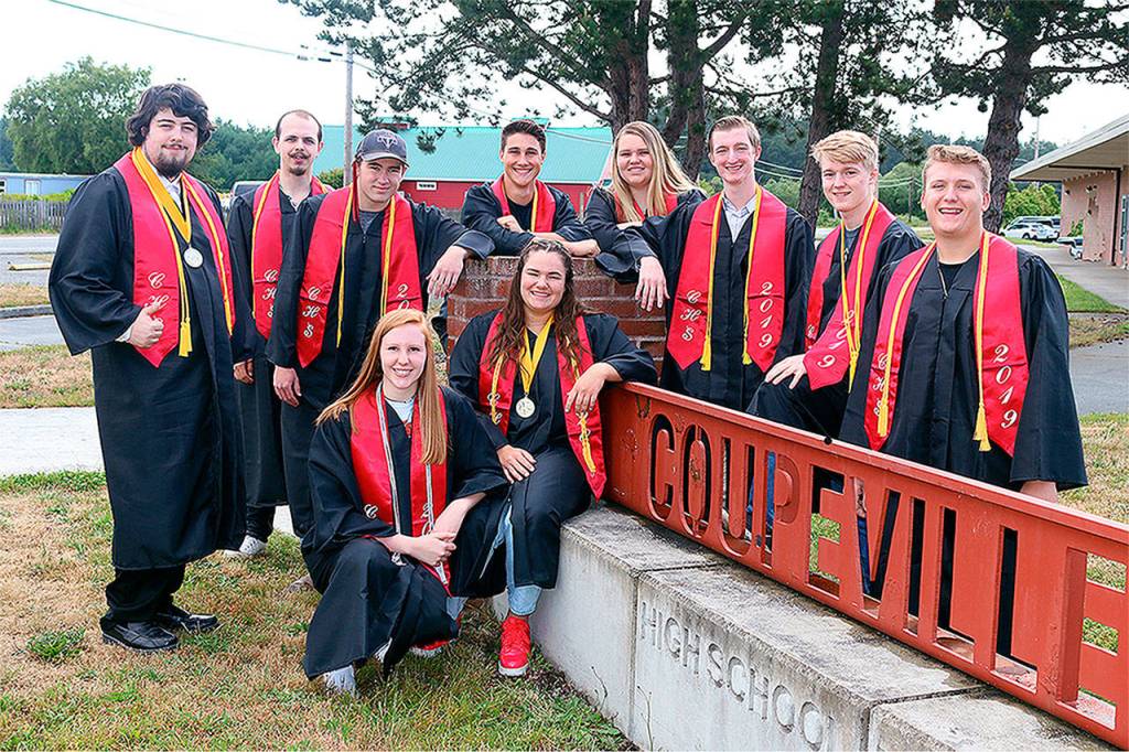 The top 10 Coupeville High School seniors are, (back row, from left) Harris Sinclair, Nikolai Lyngra, Josh Robinson, Teo Keilwitz, Veronica Crownover, Jakobi Baumann, Jaschon Baumann, Dane Lucero and (front row, left) Peytin Vondrak and Sarah Wright. Photo provided