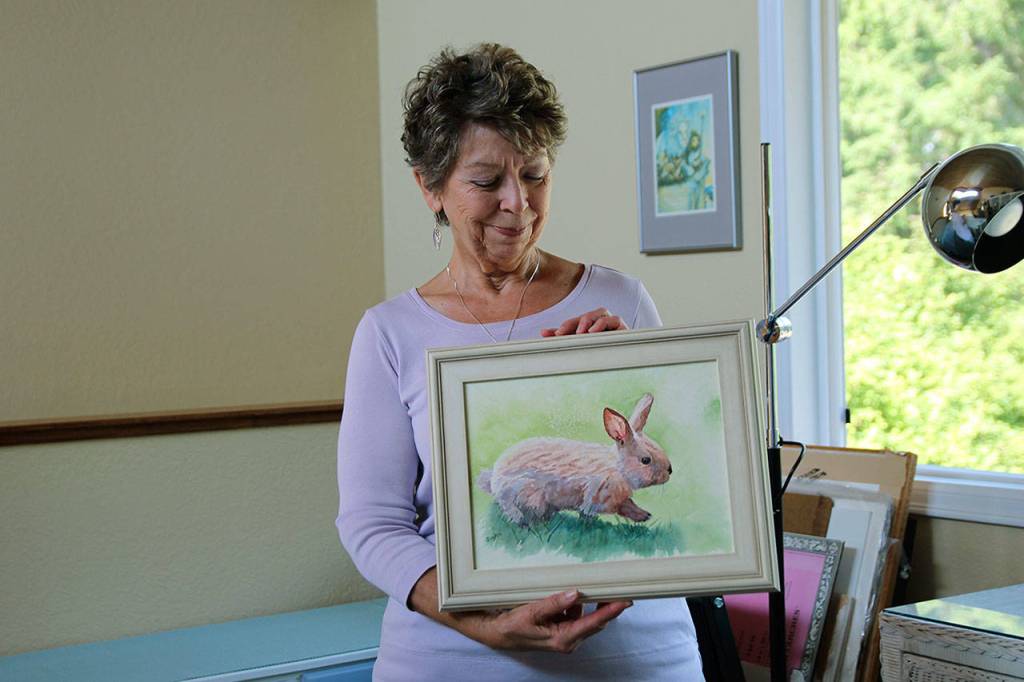 Gaylen Whiteman of Freeland will be showing three works of art at the juried art gallery, if they don’t sell before then the Artists of South Whidbey show. Here, she holds a painting that is part of her Essence of Nature series, devoted to animal conservation efforts with emphasis on the impact of climate change. She donates 10 percent of her proceeds to conversation organizations. (Photo by Maria Matson/Whidbey News Group)