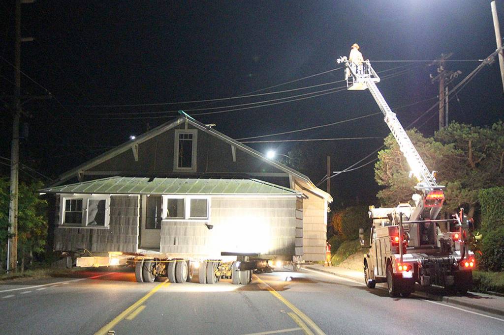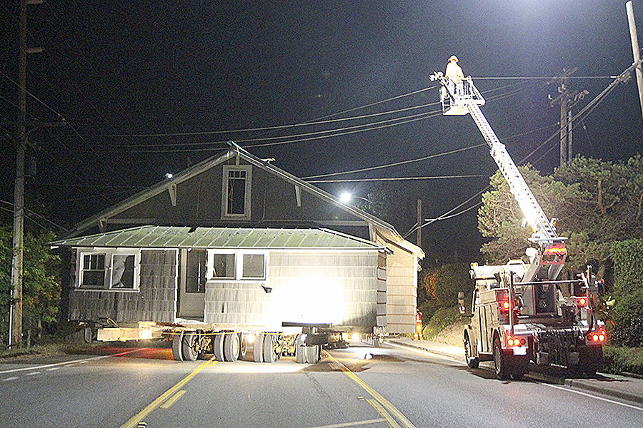 Just past midnight Tuesday, two houses moved down the highway at the south end of Oak Harbor as part of a slow-moving procession of large trucks, utility vehicles and cop cars.