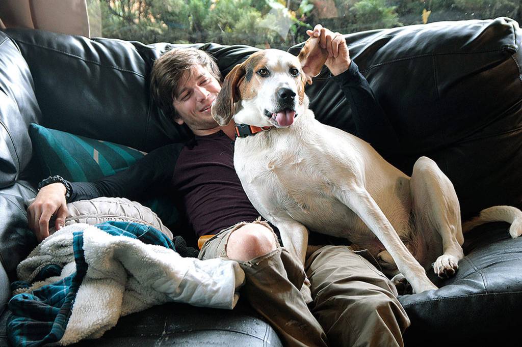 Photo by Laura Guido/Whidbey News-Times                                Spencer Tlougan, 23, cuddles with the resident canine Loki at Ryan’s House for Youth in Coupeville.