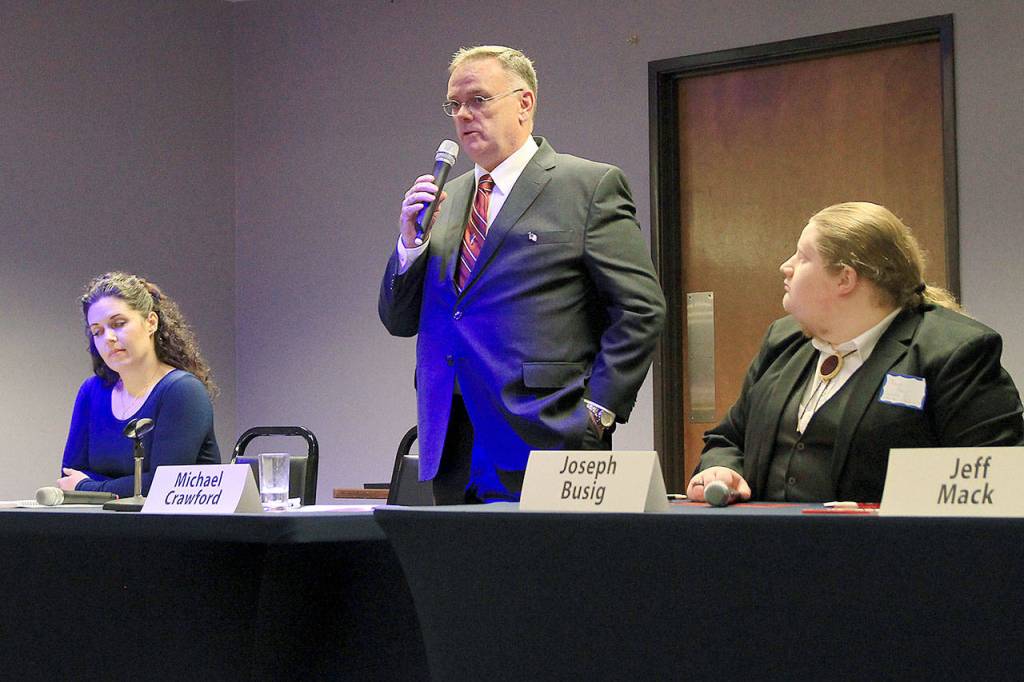 Both Crawford and Mack spoke against the transportation benefit district’s ballot measure to raise taxes by two-tenths of 1 percent for street repair and maintenance over a 10-year period. Crawford said the citizens are still reeling over the tripling of sewage rates because of the cost of the new “poop factory.” They both said there must be other options for fixing crumbling streets than a sales tax increase or a car tab fee, which are two choices available through the transportation benefit district.