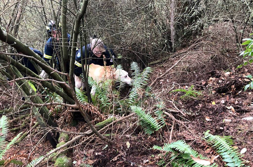 Gus’ family heard him barking from about 30-feet down a densely vegetated escarpment near Smugglers Cove Road and called for help, according to Deputy Chief Charlie Smith of Central Whidbey Island Fire and Rescue.