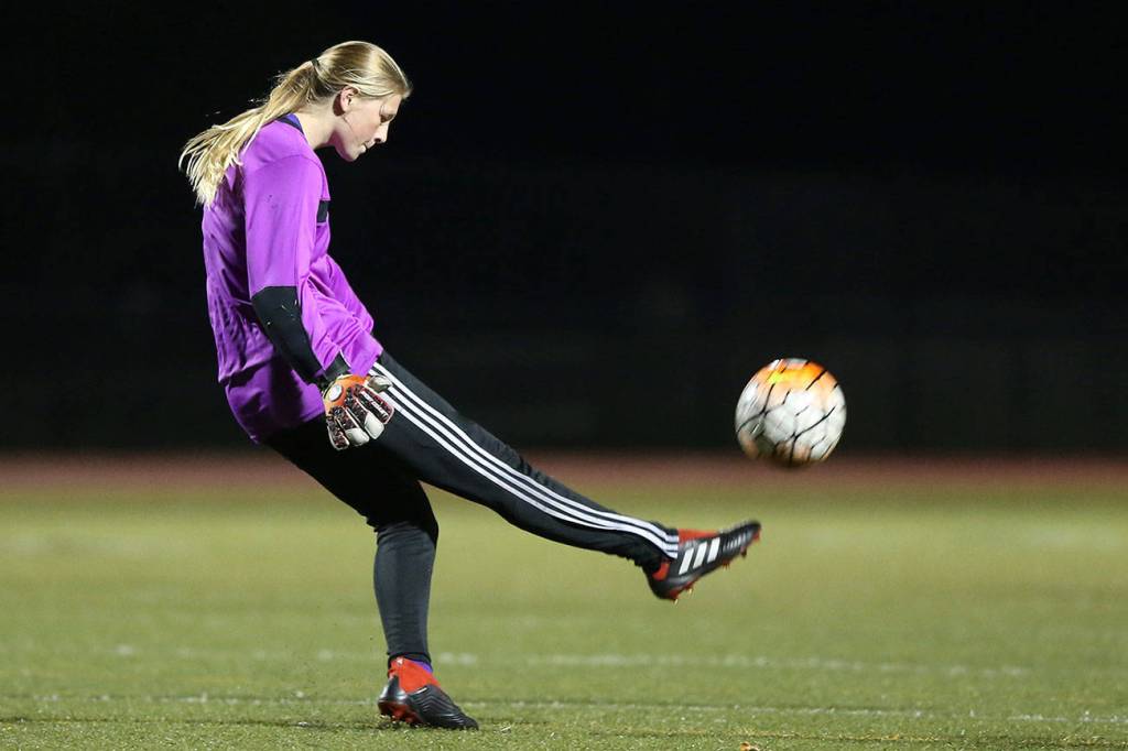 Oak Harbor goalkeeper Tiana Jackson scoops up a Stanwood shot. Jackson moved to the front in the second half and scored both Oak Harbor goals.(Photo by John Fisken)