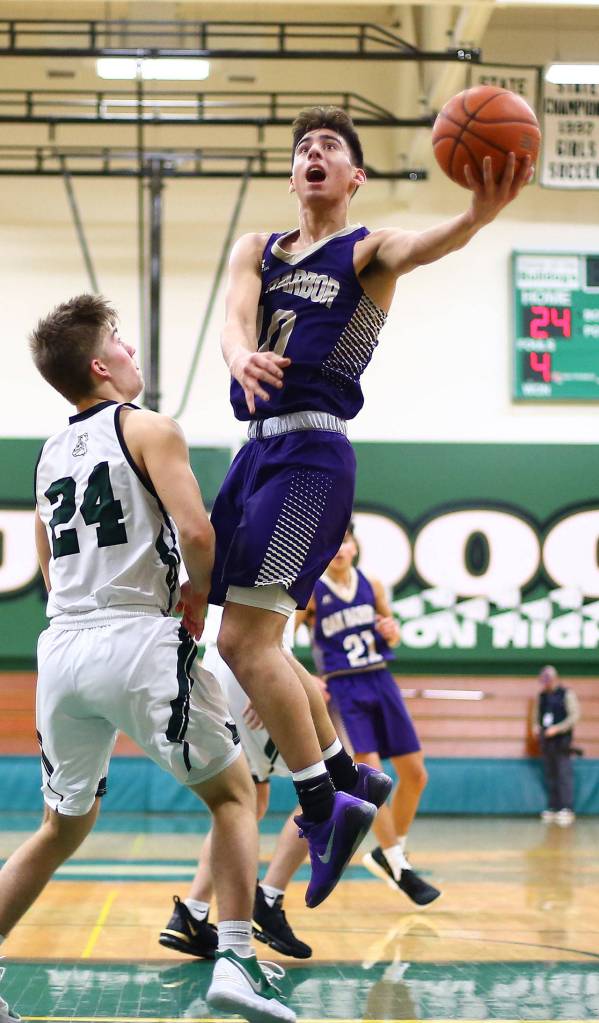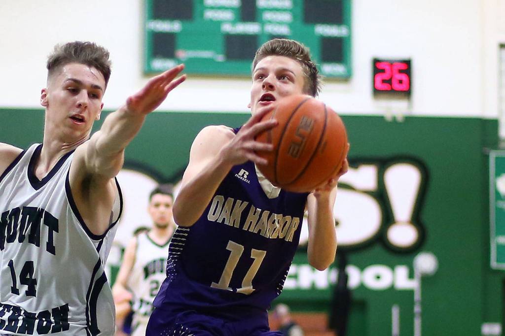 Gage McLeod scored half of Oak Harbor’s points in the game, netting 18 with the help four three-pointers.
