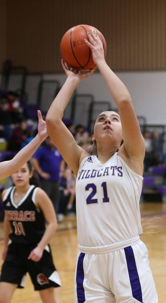 Oak Harbor’s Mikhaela Cortez shoots against Mountlake Terrace. (Photo by John Fisken)