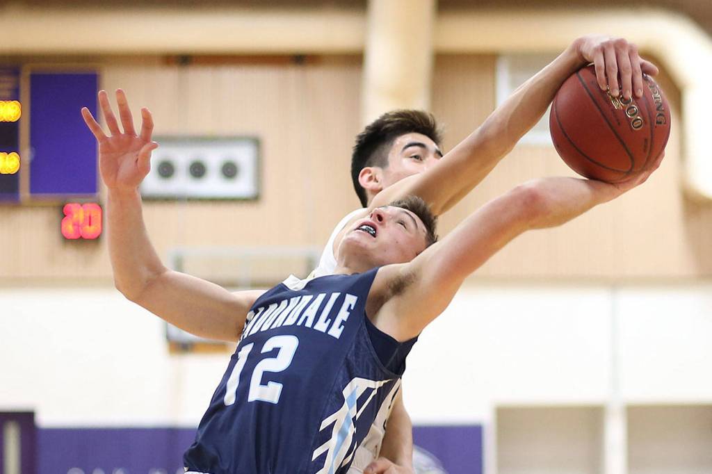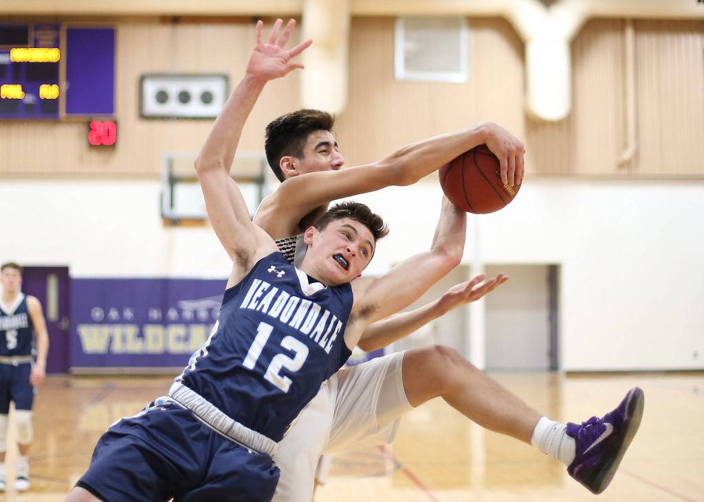 Oak Harbor’s Will Rankin, left, and Brock Boyer battle for a rebound against Meadowdale.(Photo by John Fisken)