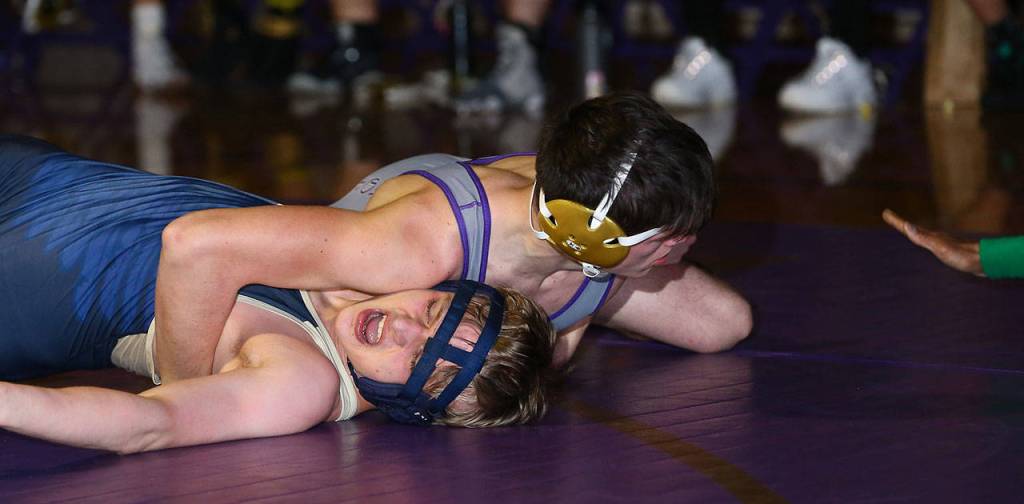 Oak Harbor’s Ivan Snyder, top, pins Arlington’s Hunter Strande in the first period Thursday.(Photo by John Fisken)