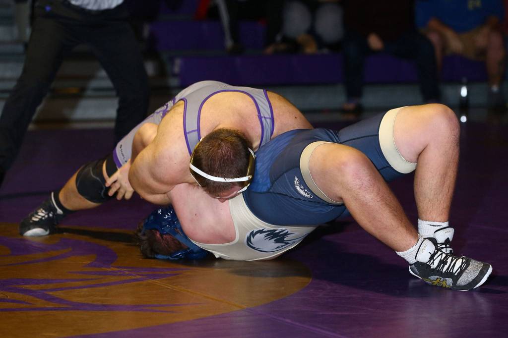 Oak Harbor’s Tim Powers, front, tries to put Cole Phillips on his back.(Photo by John Fisken)