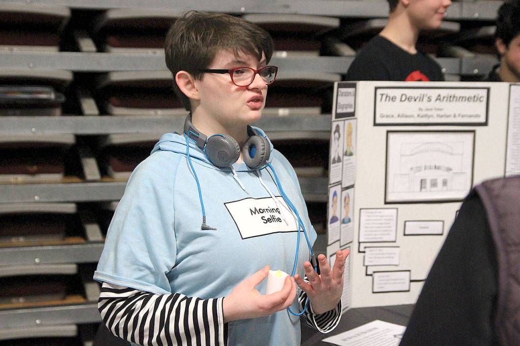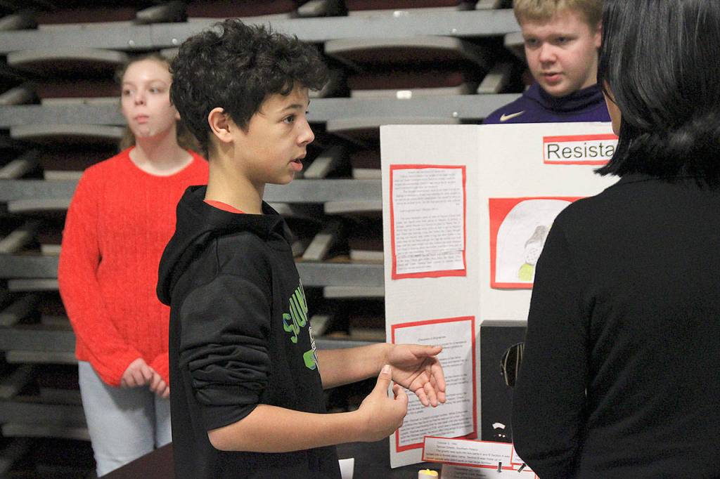Coupeville Middle School eighth graders have spent the past few months of English class in different book groups reading historical fiction about the Holocaust and researching the event. On Monday, the groups shared displays that illustrated the lessons they learned and answered questions from passing visitors during the book exhibit.
