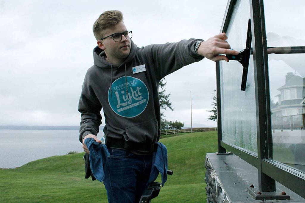 Photo by Kira Erickson/Whidbey News Group                                Business owner Oliver Hansen cleans a window at a Mutiny Bay residence on Monday.