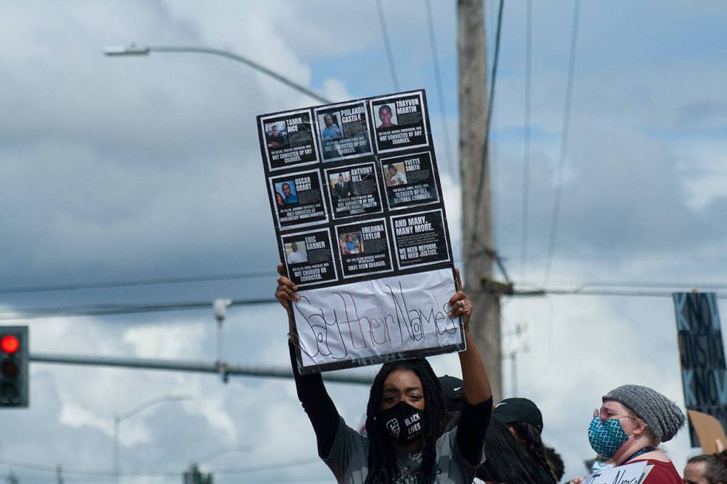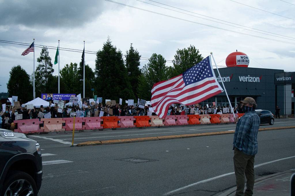 Organizer Sarah Griggs said that while she was surprised by the turnout last time, the dour weather and 24-hour notice didn’t help. This week, however, several hundred protestors displayed solidarity with the Black Lives Matter movement — so many that the protestors spilled from the orange barricades that lined Beeksma Gateway Park at the intersection of State Highway 20 and Beeksma Drive.