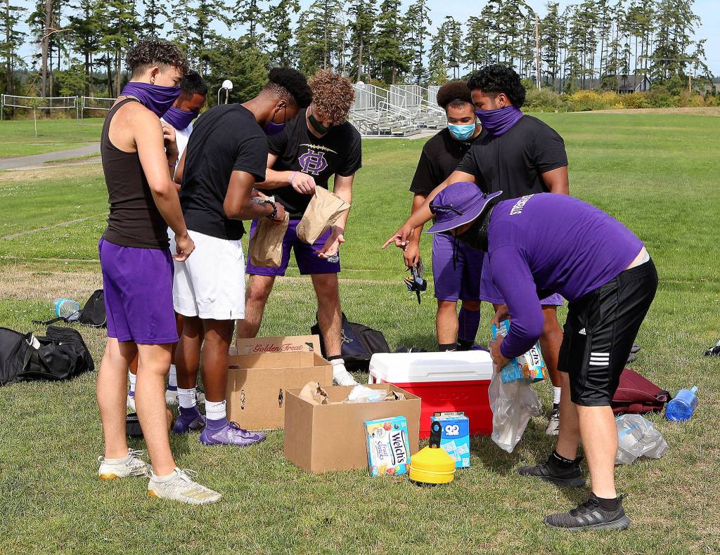 Oak Harbor High School’s facilities are closed until mid-October, so Heefner is currently feeding students out of a cooler when they meet for conditioning at local parks.