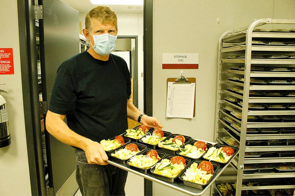 Andreas Wurzrainer, chef and director of the Coupeville School District’s Connected Food Program, lifts a tray with pasta, meatloaf and zucchini. Photo by Kira Erickson/Whidbey News-Times
