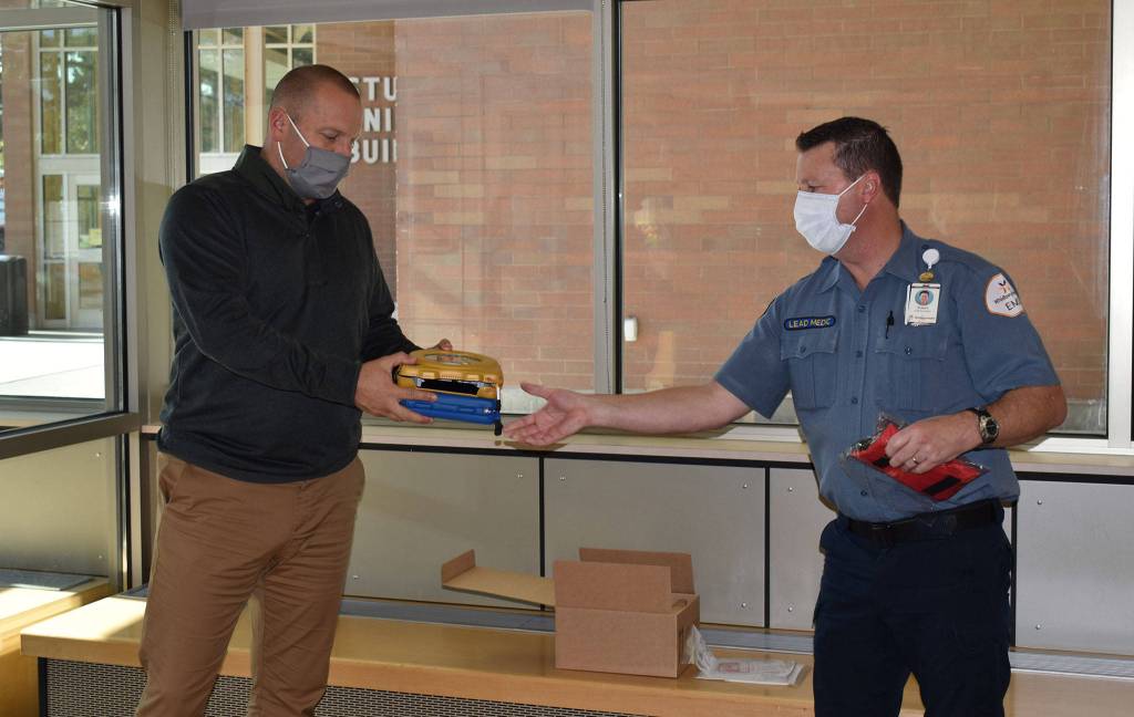 Oak Harbor Athletic Director Jerrod Fleury asked Roger Meyers, manager of WhidbeyHealth EMS, if he could provide the school with an AED to accompany teams traveling off campus.