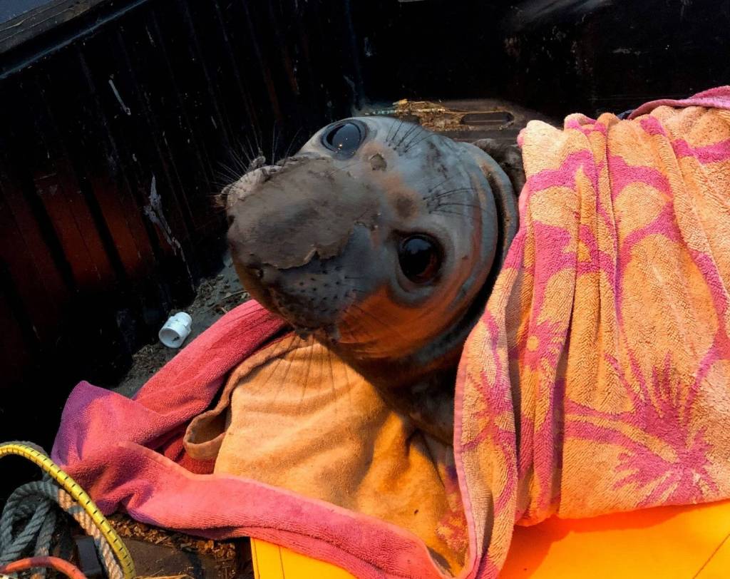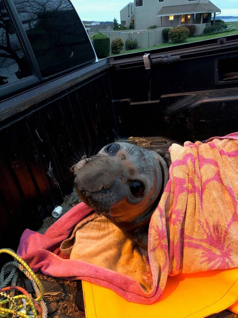 A veterinarian from the mainland arrived on scene to check on Elwood, who was bundled in towels and placed in the bed of a truck.