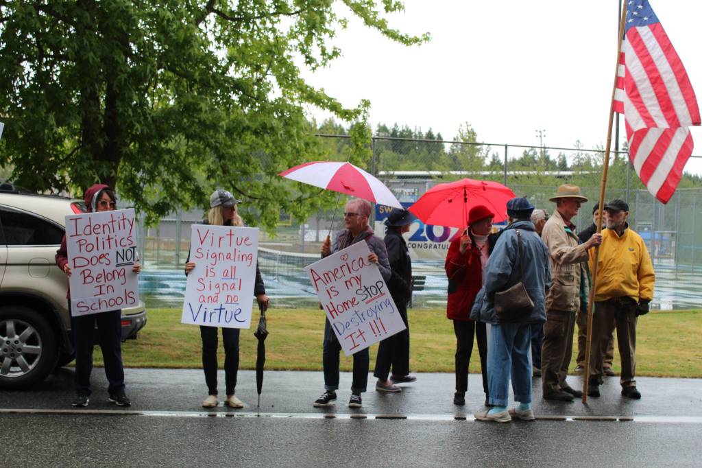 Hundreds of demonstrators lined the street in front of South Whidbey High School on Friday afternoon to voice their support for — or opposition to — school board education policies.