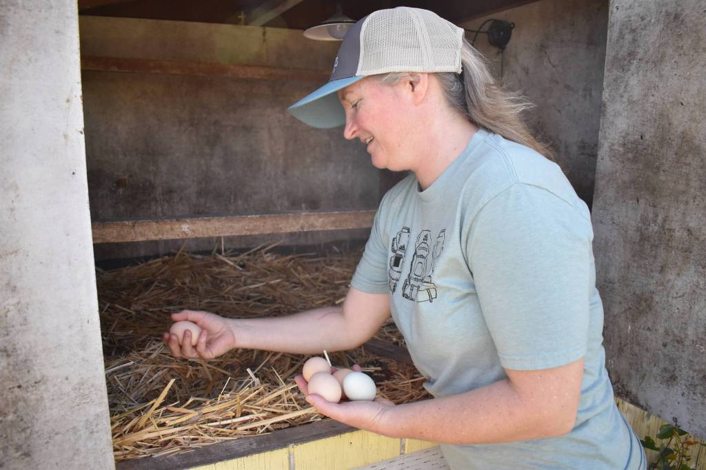 They have a heritage breed of turkey called Bourbon Red and fast-growing Jumbo Cornish Cross meat chicken. There are several breeds of egg-laying chickens on the small farm. Melissa Stewart also has a few different types of chickens that she keeps as pets that lay eggs in all types of colors – including light green.