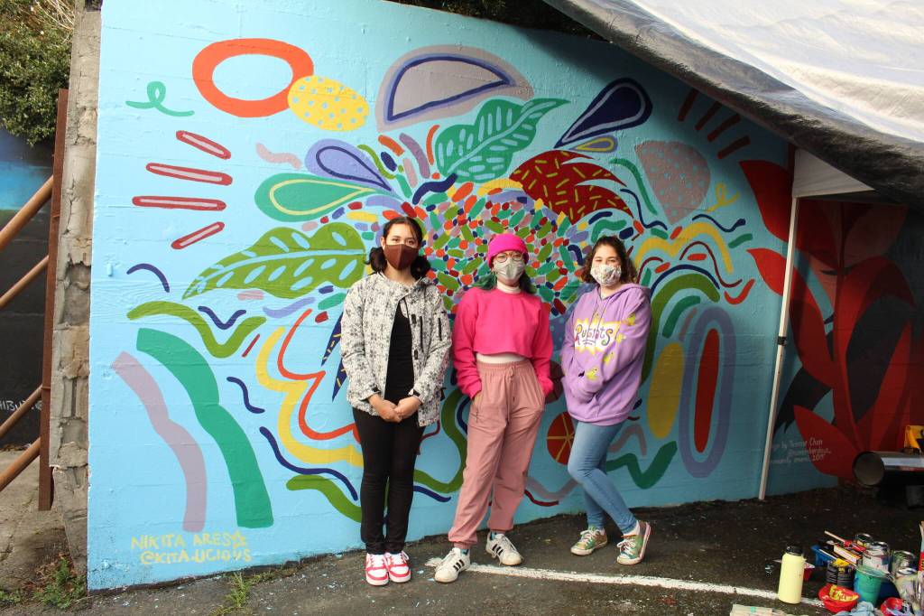 The new mural was painted by Seattle-based artist Nikita Ares. She said the colors of local Oregon grape plants and the welcoming energy she felt when she came to the city inspired her design.