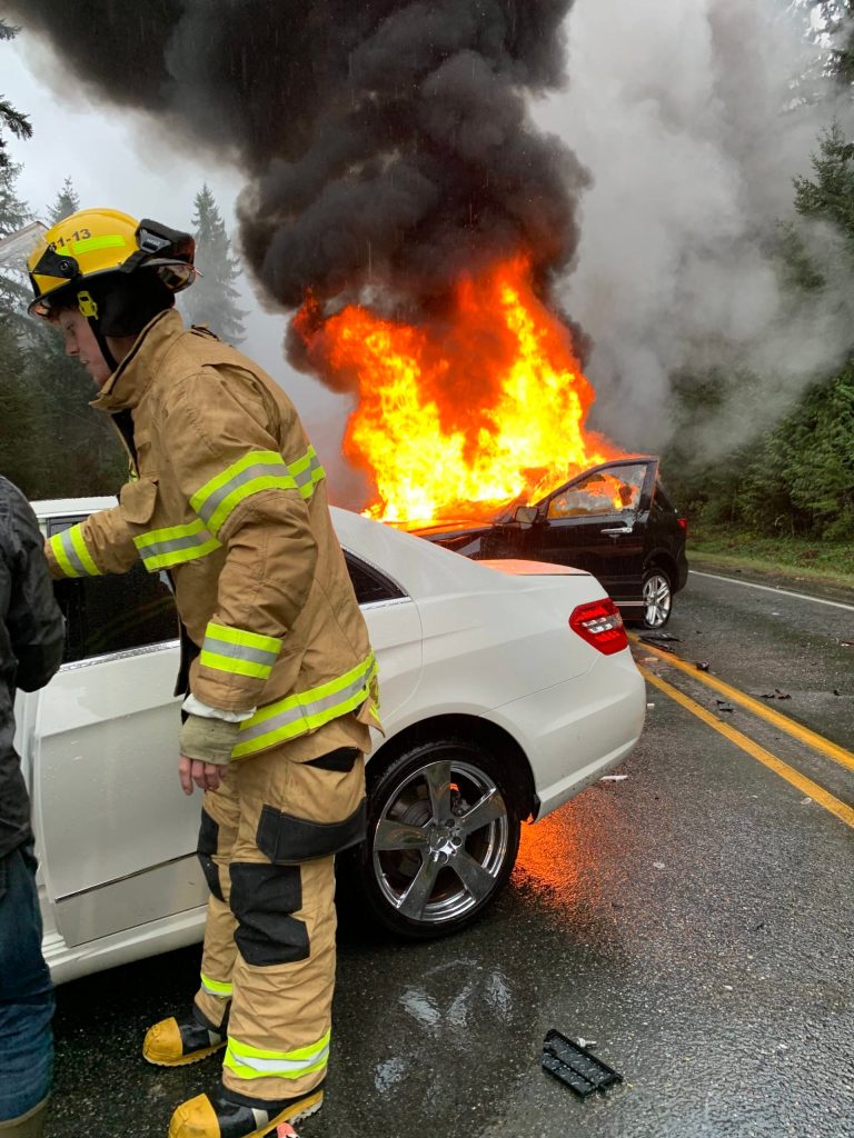 Rusty Palmer, the fire chief for South Whidbey Fire/EMS, said it is not uncommon for fuel lines, wires and battery cables to be torn apart in vehicles after a head-on collision. Fuel on the hot engine or a spark from a damaged battery can cause a fire such as the one seen Saturday.