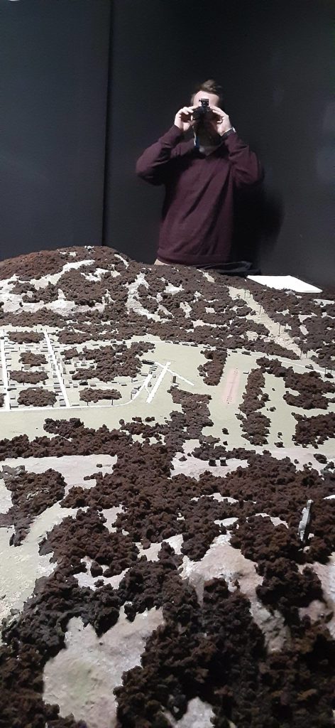 The room contains a topographical display, lit in a way that simulates moonlight. Through the highly sensitive vintage night vision goggles, museum visitors can see the miniature landscape as if they were pilots flying over it in the darkness.