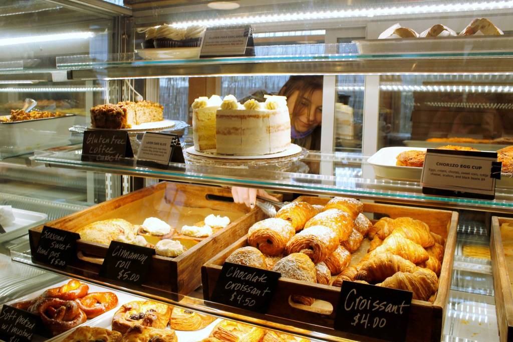 Barista Kelsey Coutts grabs a croissant from the case at Seabiscuit Bakery.