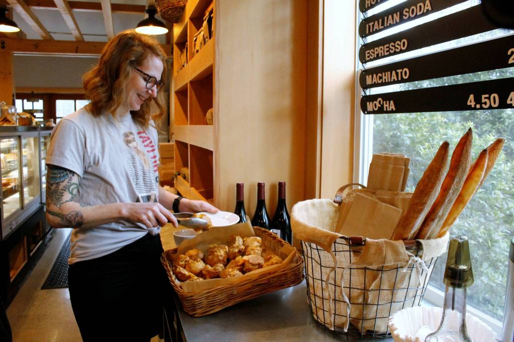 Hannah McCabe, the manager of Seabiscuit Bakery, grabs a gougère to serve.