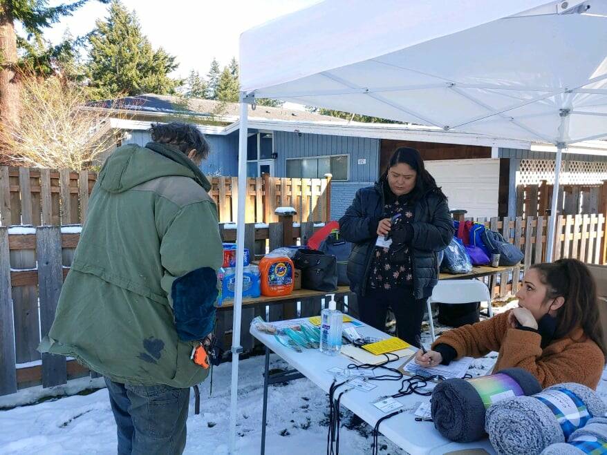A community member receives resources from Whidbey Homeless Coalition Interim Executive Director Tanya Stager Gran, middle, and Residences Manager Ashley Rowley during the Island County Point in Time count this year.