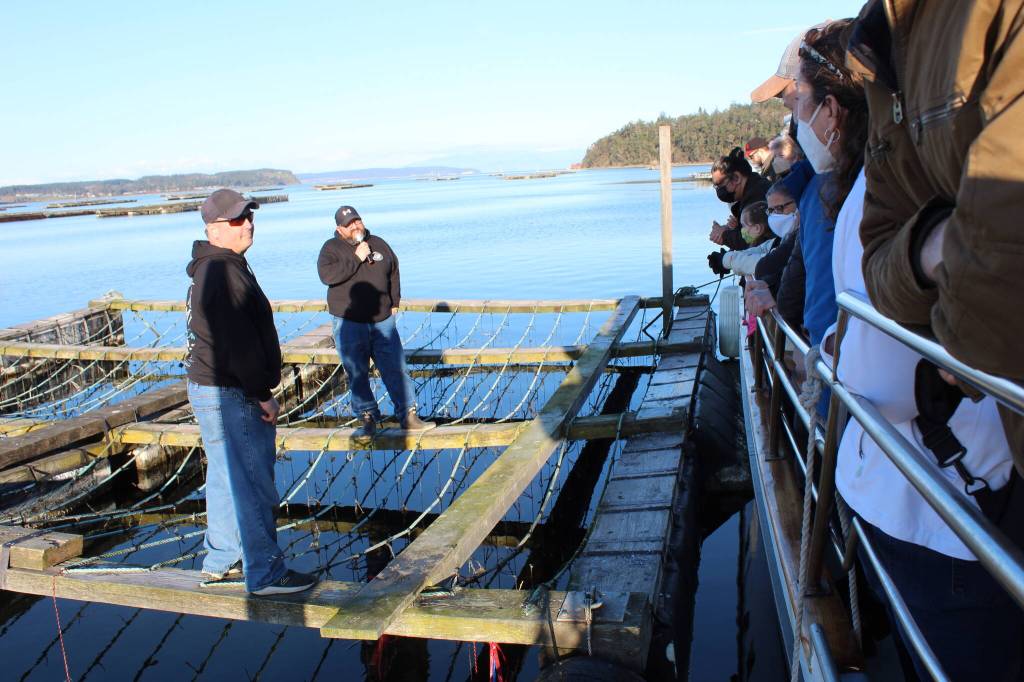 Daryl Beerbower displays a line of mussels on a tour of a Coupeville mussel farm during the Penn Cove Musselfest March 5. Behind him, Aaron Schmidt takes questions from tourists.